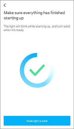 8. Une fois que votre nœud secondaire a une lumière bleue fixe, appuyez sur Node light is solid (La lumière du nœud est solide). Selon le modèle du nœud secondaire que vous ajoutez, le voyant doit être violet ou bleu fixe, indiquant que le nœud est prêt à être configuré