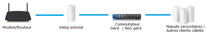REMARQUE: Les périphériques Velop connectés à un commutateur peuvent afficher un statut de périphérique incorrect dans l'application Linksys app ou sur la page web de configuration. Malgré avoir une connexion, il est possible que vous voyiez un voyant rouge ou que l'appareil apparaisse hors ligne au lieu d'être connecté, et inversement.