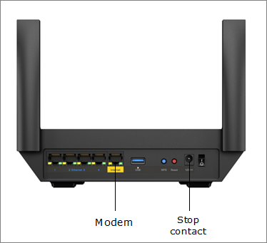 Als u meer dan één router heeft, kiest u één van de routers, sluit u vervolgens uw modem aan op de internet poort van de router en schakelt u deze in. Het lampje aan de voorkant begint paars te knipperen.