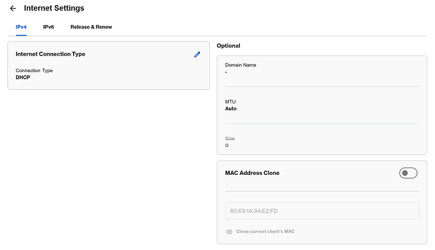 3. Seleccione su tipo de conexión. A continuación, clone la dirección MAC según sea necesario. Para ello, active el mosaico Clonar dirección MAC y haga clic en Clone current client's MAC (Clonar MAC del cliente actual) o introduzca manualmente la dirección MAC. Haga clic en Save (Guardar) para aplicar la configuración.