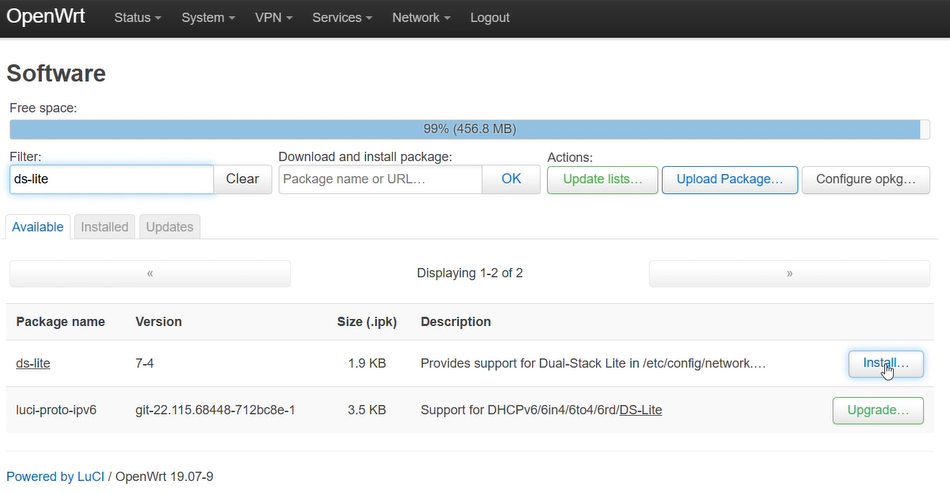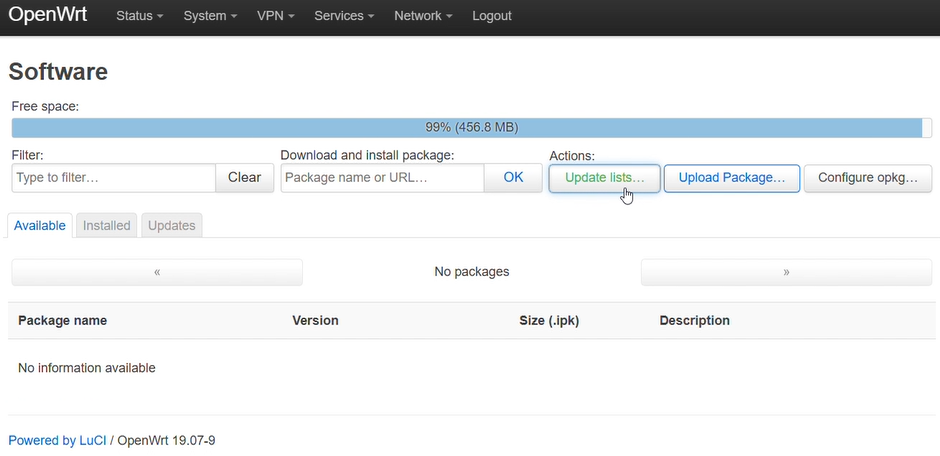 Luci WEB管理画面に入り、System → Softwareを選択します