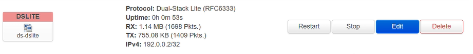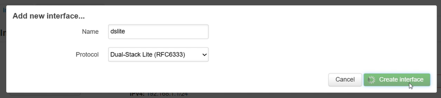 Dual-Stack Lite (RFC6333)プロトコルを選び、適切な名称を決めて「Create interface」をクリックします