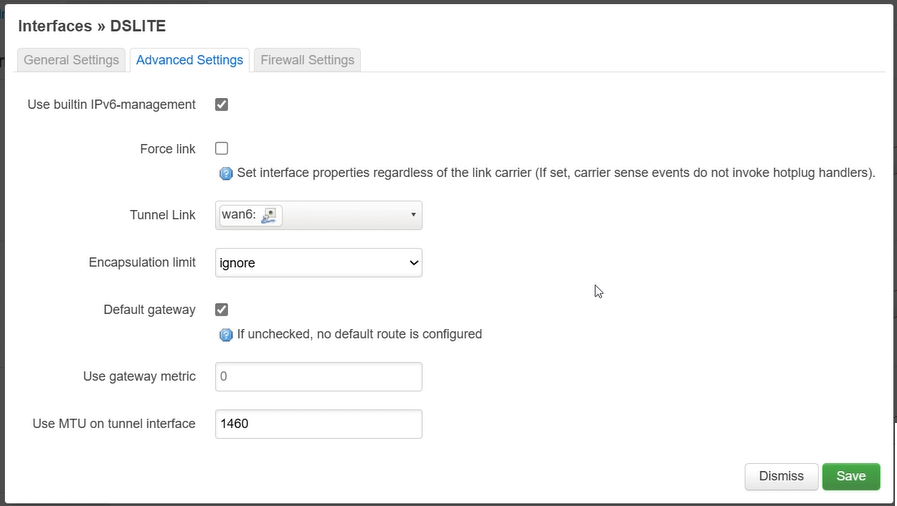 Advanced Settingsでは、Tunnel Linkをwan6、MTUを1460に変更します